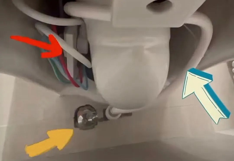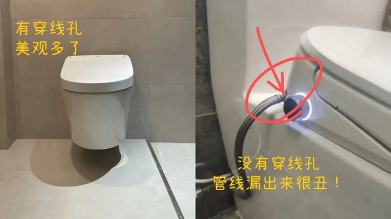 为了防止智能马桶水阀的管线漏出来,尽量选择这种带有穿线孔的马桶,这样管线从内部穿进来,完全不外漏。