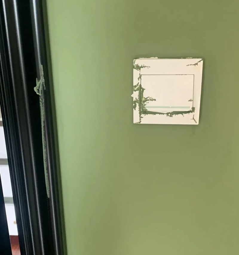 安装顺序也一定要注意,像这种乳胶漆没喷就先把开关装好的,必然导致插座被污染,还不好清洁的问题。